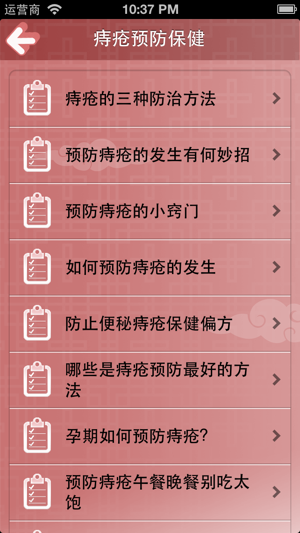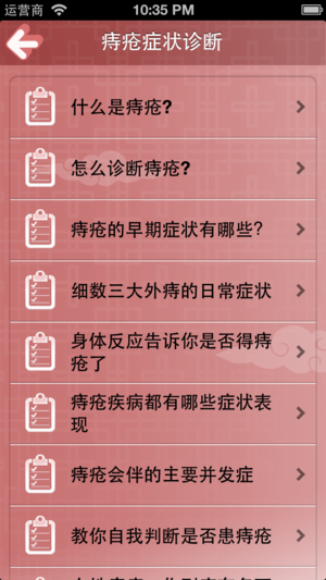 离线浏览,不用联网也可以使用,速度快,无广告,无插件。 你是个痔疮患者吗,或者说你家里就有一个痔疮患者?想了解痔疮这种病是怎么得的吗?想知道该如何诊断痔疮吗?怎么治疗呢?由怎么预防? 该软件集痔疮症状诊断、常识病因、治疗用药、预防保健、病后护理、病例解析、治疗偏方全面的系统地介绍,重点向患者的调理常识及调理方法,旨在全面普及痔疮的基本防治知识,以充分调动患者自我调理的主观能动性,提高患者的自我康复意识和能力。