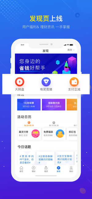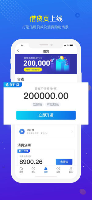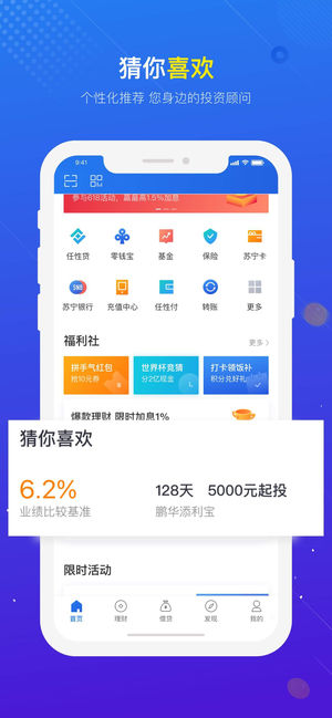 【苏宁金融介绍】 苏宁金融是中国金融O2O先行者。凭借苏宁线上线下海量的用户群体、特有的O2O零售模式和从采购到物流的全价值链经营模式,建立支付账户、投资理财、消费金融、商业保理、预付卡等业务模块,打造了苏宁易付宝、苏宁理财、任性付、任性贷、供应链融资、电器延保等一系列知名产品,为消费者和企业提供多场景的金融服务体验。 【苏宁金融主要功能】 1.月添利:短期理财首选,预期年化收益4.55%,30天/周期,到期自动续投。 2.任性付:苏宁金融旗下信用支付方式,0首付、0手续费、30天免息,最长可分24期,不定期开展12期免息活动,支持苏宁易购自营所有商品! 3.任性贷:苏宁金融旗下消费贷款品牌…