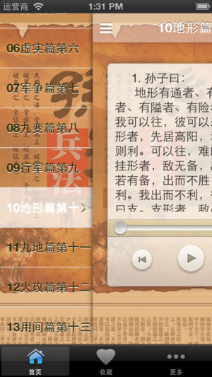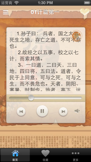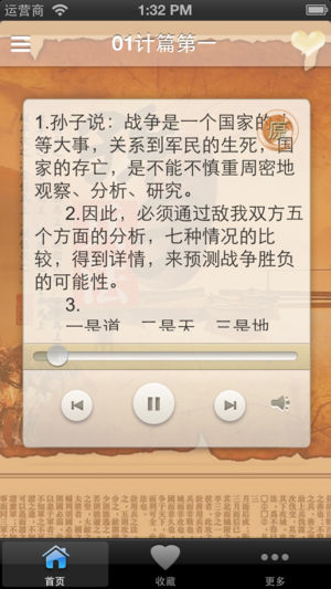【★】离线收听, 不耗流量,速度快,不用联网一样可以收听和浏览,无广告,无插件,只卖6元。 【★】支持后台播放,方便、省电 【★】支持原文、译文显示 【★★】《孙子兵法》是中国最古老、最杰出的一部兵书,历来备受推崇,研习者辈出。(孙武)以兵法见於吴王阖庐。阖庐曰:“子之十三篇,吾尽观之矣,可以小试勒兵乎?”一般称《孙子兵法》都是说有十三篇。《孙子兵法》是世界上最为著名的三大兵书之一,而且最享大名的 。 《孙子兵法》中有一句话道出了整部书的核心思想,乃“不战而屈人之兵”!讲的就是不需要战争就迫使敌人屈服。以下是《孙子兵法》全部内容的主要归纳: 《始计篇》第一、讲的是庙算,即出兵前在庙…