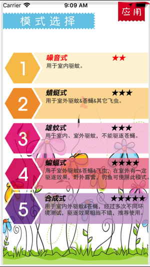 *概要: 本产品是利用您的iphone发出超声波以达到驱蚊驱苍蝇的效果,注意,是超声波,不是电磁波,也不是次声波,所以本产品不但环保节能而且对人体无害。 *使用方法: 本产品使用起来非常简单,首先你要到设置里面选择好你需要的模式,然后点击“确定”按钮回到主页,开启开关即可使用。 当你觉得正在使用的style对你现在所处的环境驱虫效果不佳时,你可以到设置页面更换模式,室内推荐使用合成式,室外推荐使用蝙蝠式。 *功能描述: 超声波只能干扰蚊子、苍蝇等飞虫活动,达到驱赶的作用,不能直接杀死它们。 本产品在研发期间,用了两种昆虫进行实验:蚊子和苍蝇。通过一次次的失败,多次反复不停的测试,最终研发出…