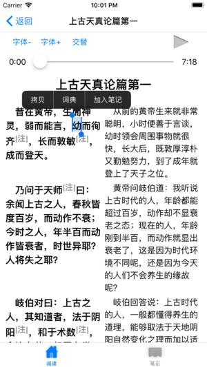 《黄帝内经》是我国现存最早的医学文献典籍,是所有学习中医者的必读之书。 本软件《黄帝内经·素问》具有以下特点: 1、文白对照。文言文和白话文同屏显示,支持对照和交替排版,轻松读阅读中医著作。 2、原文注释。在原文中增加大量注释,点击注释直接查看,难点不再成为障碍,加深阅读理解。 3、真人朗读。真人朗读优美动听,让你在眼睛得到休息的同时通过声音领略经典中医著作的魅力。 4、内置词典。内置文言文字典和高级汉语词典,阅读时遇到难懂的字、词无需联网一查即知。 5、摘录笔记。阅读中可随时将书中内容摘录到笔记中,边学边记,加深理解。 内容推荐: 《黄帝内经》包括《素问》…