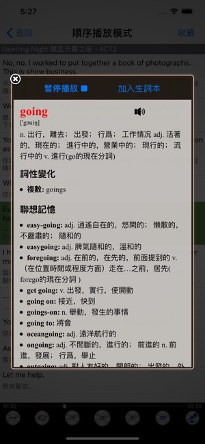 本应用包含《走遍美国》全集音频。其中前五集为免费体验部分。标准美式发音,中英文同步字幕,有声英汉全文字典,随点随读。欢迎下载免费试用! 文中每个英文单词都有详细的解释, 音标, 发音以及例句用法, 在阅读的时候只需在任意单词上长按, 即可查阅, 即点即译, 真正做到哪里不懂点哪里。 同时单词可随时收藏查看,播放设置灵活,使用方便!一次下载,无需联网。所有IOS设备通用。