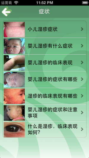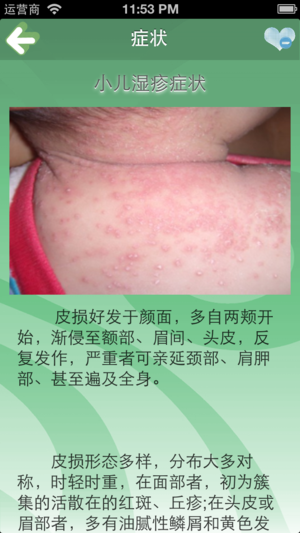 无广告,不耗流量,不用上网也可以使用。 小儿湿疹是一种变态反应性皮肤病,就是平常说的过敏性皮肤病。主要原因是对食入物、吸入物或接触物不耐受或过敏所致。患有湿疹的孩子起初皮肤发红、出现皮疹、继之皮肤发糙、脱屑,抚摩孩子的皮肤如同触摸在砂纸上一样。遇热、遇湿都可使湿疹表现显著。 该软件对宝贝湿疹的病因、症状、治疗护理、检查诊断、预防保健、食疗、偏方进行深入分析,使您护理和治疗的贴心助手。