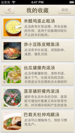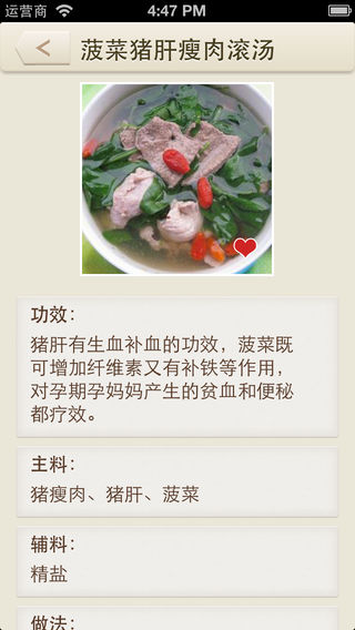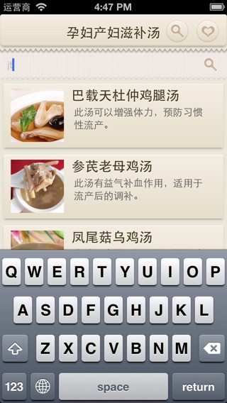 我现在是孩子爸爸,陪着我的妻子经历了怀孕生产的全过程。但是对于我们年轻一代来说,缺少生活的经验,有时想弄一些滋补汤给她补一下身体也无从下手;于是我想做一本专门针对孕产妇的滋补汤的电子菜谱。 经过一段时间的努力,《孕产妇滋补汤》 终于诞生了。它收集了各种常见的孕产妇滋补汤,每款汤都配有精美图片,同时有功效、主料、辅料及做法。考虑到这款App的使用者可能主要会是女性,软件设计风格精美,操作简单,有搜索、收藏等功能。 我相信 《孕产妇滋补汤》 一定是每个家庭必备之选。 我们的口号是: 最好用的孕产妇滋补菜谱,让宝宝更健康,妈妈更美丽。