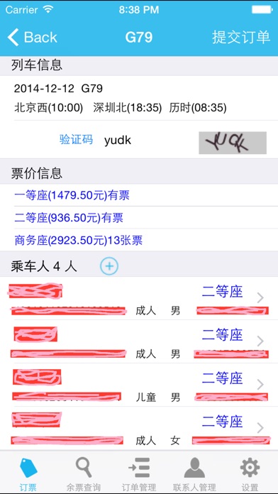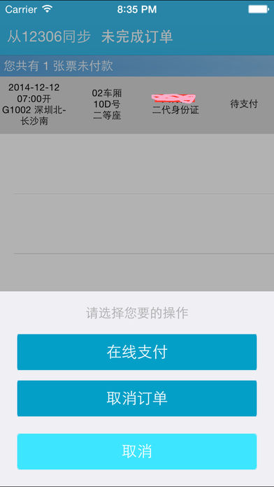 支持 支付宝 付款,支持60天(含当日)内的购票,无任何手续费。 简约而不简单,不排队,不早起,5 步轻松搞定火车票。 登录-搜索车票-添加乘车人-提交订单-付款,买票也就仅此而已,您还可以方便快捷的改签和退票。 与官网 www.12306.cn 数据同步。 主要功能: 1、登录/注销,成功登录后,我们将保留登录状态,只要不超时(20-30分钟内),下次不用登录,您便可继续使用。 2、用户注册、登录、修改密码、找回密码 简单方便。 3、预订(支持20天(含当日)内的购票)、支付、改签、退票 方便快捷,一气呵成。 4、订单管理:订单查询,取消订单,订单改签,退票。 5、联系人管理:新增联系人,修改联系人,删除联系人。 6、余票查询:列车票价,短信或邮件发送接车信息。 7、密码管理:密码修改,密码找回。 8、增加网上支付(招商银行、建行和支付宝 完美支持)。 支持支付的银行:支付宝、招商银行、 建设银行、交通银行、浦发银行、光大银行、平安银行、兴业银行、北京银行、民生银行、华夏银行。 不支持支付的银行:工商银行 、农业银行、中国银行、中心银行、广发银行、上海银行、上海农业银行、中国银行。 技术/使用支持 Email:1815184089@qq.com
