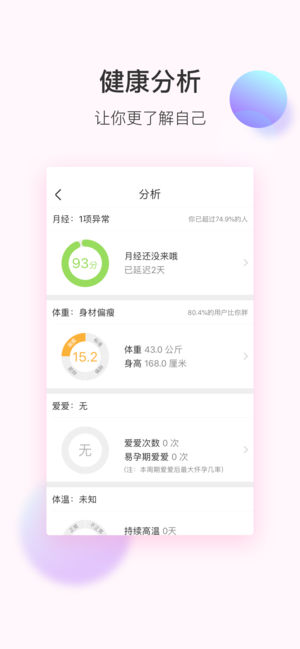 超过2亿女生在用的经期记录软件,越记越准哦~ 【热门影视综艺推荐APP,贴心守护你】 《演员的品格》联合赞助,《国风美少年》行业赞助,《女儿们的恋爱》合作伙伴。 不仅有越用越懂你的经期智能提醒模式,还可根据需要切换为备孕/怀孕/育儿模式,为准妈妈们提供丰富的孕产知识,贴心的孕期提醒。记录宝宝成长瞬间,给妈妈们提供宝宝成长的科学建议,陪伴女生成长的每一个重要时期!同时还为女生提供了健康、情感、瘦身、美容、购物的知识贴,内置真实的女生交流区。 ●俘获女人心的四大功能● #贴心预测,及时提醒月经期# 女生的贴身健康管家,记录、预测、提醒,一应俱全,让你避免忘记经期的尴尬,记录你每天的心情、健…
