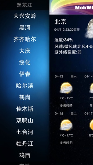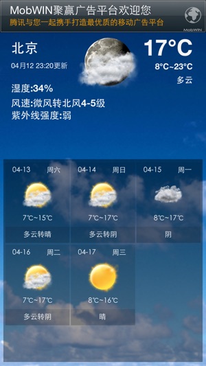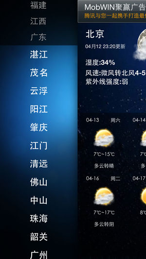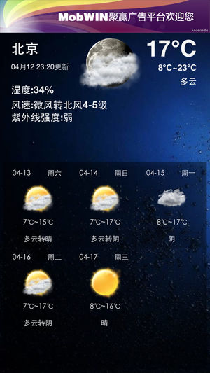移动天气全面的城市覆盖,基本覆盖国内城市的实况、多日天气预报,并且与微博、qq等紧密结合支持天气分享到微博、qq空间。移动天气采用权威数据源信息可靠。