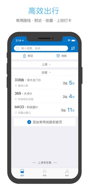 实时公交神器,泛娱乐化的实用工具。让您轻松知道最近的公交站、地铁站位置,一键规划公交、地铁最优出行线路,实时公交电子站牌,随身移动。从此摆脱傻等公交、追公交、上不了公交的尴尬局面。另设上班打卡功能,是上班族不迟到的首选,等车进入同城逛一逛,看看新鲜事、撩撩美女,一不小心还有礼品…… 【软件介绍】 1、数据精准:出门前查好公交,你到了公交站,刚好上车。 2、方便快捷:可通过换乘获取便捷出行方案;常用线路收藏直接在APP首页显示;可一键切换公交行车方向;地图上查看公车在线路上精准位置。 3、标签管理:收藏线路命名,一键批量上车提醒,可自定义到站时间或站点提醒。 4、精神支持:上班打卡不迟到…