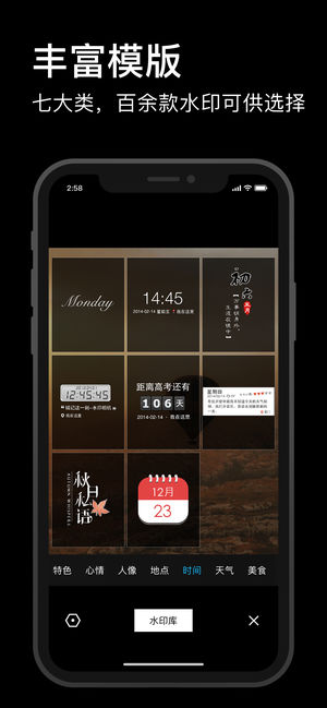 国内首款最文艺、最受欢迎的照片水印添加软件。 丰富的模版,新颖的玩法,把“好故事”印在照片上! -------产品功能介绍------- 【丰富类型】特色、心情、人像、天气、地点、时间、美食,七大类百余款水印; 【智能模版】天气、地点、时间、分贝、海拔、速度,智能水印自动添加; 【个性内容】给美食打分、设置纪念日、修改地点、编辑心情文字等; 【人像水印】真身大鉴定、魅力值、夫妻脸等,让一个人的拍照成为一群人的欢乐; 【一键分享】微信好友、朋友圈、QQ空间、QQ好友等各大社交平台,一键轻松分享。