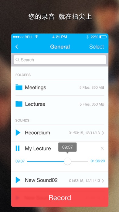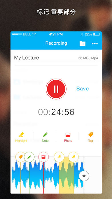 Top 10 in more than 104 countries, Recordium is now a de facto voice recording solution! 由苹果、TheNextWeb、The Guardian、LifeHacker、The Telegraph、MakeUseOf、iMore、AppAdvice和其他更多所精选! Recordium是一个专为iPhone, iPad, 和iPod Touch设计的功能强大,界面美观的录音软件。Recordium让你在播放或录制音频的同时标记重点部分,帮助你将注意力集中在录音中最重要的部分上。你可以轻松地将笔记,标签,和图片之类的附件加入录音中的任何部分,方便你在录音中进行搜索,使你迅速找到音频中被标记的重要的部分。你可以通过Dropbox和其他云应用软件来和你的朋友分享录音。Recordium拥有直观的使用界面,流畅的录音回放,用户可以通过各种压缩算法来自定义录音的大小和质量。这些特殊的功能使Recordium成为了人人手中必备的工具,尤其是学生,新闻记者,和音乐人。 Recordium, 看见你所听见! Recordium的特殊功能: *****标记录音中的重点部分***** 在录制或回放的同时标记一段音频中的重要部分。 轻松地在可触控的波形图上编辑重点部分 ****注释**** 添加你想要的任何标记。 在录音的不同部分添加多个笔记。 在录音的任何部分附加照片。(来自照相机或设备中的相簿) 通过单击预览你添加的注释。 轻松地在音频中移动注释。 通过单击编辑或删除注释内容。 **编辑工具** 修改或去除录音中任何多余的部分。 剪切录音中的任何部分来创建新的文件。 删除任何部分,即使是一段录音最中间的部分。 **高质量录音** 3种可调节的采样率(8, 22, 44.1 kHz)来定义录音的大小和质量。 4种不同的录音格式:WAV,CAF,AIFF,MP4. 特殊的MP4压缩格式:(比如将一小时的录音压缩到小于30MB。) **强大的录音** 后台录音和回放。 录音时暂停。 中断保护让你在录音中途接完电话后继续录音。 录音无时间限制,想录多久都可以。 自动保存让你不会丢失任何录音。 增强的录音音量让你更好地捕捉远距离的声音。 自动暂停功能可以跳过对话间隔来降低文件大小。 **强大的文件共享** 将你的录音上传到Dropbox, Google Drive, Evernote和其他云应用软件。 直接从Recordium将你的录音以邮件形式发出。 通过无线同步将你的录音传输到电脑上。 iTunes文件共享。 **文件管理** 通过标题,标签,笔记搜索文件。 迅速从文件列表中播放录音。 便捷的文件和文件夹管理系统。 在录音和回放过程中修改文件和文件夹名。 增加,删除,移动,以及重命名你的录音文件。 详尽的录音信息显示,包括大小,长短,和日期。 **导入多种格式** 导入音频文件格式,包括:MP3, MP4, WAV, AIFF, 和CAF。 **回放** 高敏感度的波形图。 放大,缩小,通过可触控的波形图进行可视化控制。 不同的回放速度以及可进行修改的音调。 5秒快进或倒带。 **愿望清单** 为你在下一次的Recordium更新中想看到的功能投票。未来的更新中将包含投票排名最先的功能。 我们非常期待听到你的反馈。
