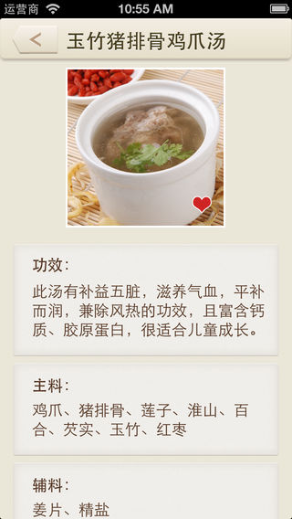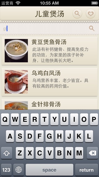 每一个父母都希望自己的孩子能够健康成长,但是几乎每个孩子都有不爱吃饭、身体不舒服的时候;这个时候作父母都看在眼里,疼在心里。 我也是一位父亲,我也碰到过和大家同样的问题。有时老人在身边的时候,常给我们帮忙,做做这个汤、煲一下那个汤;但是真的要自己给小孩做起来的时候,就有点不知所措了。 于是我们精心收集了一些专门针对儿童的煲汤资料,虽然数量不多,但是每款汤有不同的功效,解决儿童生长发育过程中的各种问题。 每款汤都配有精美图片、功效、主料、辅料及做法;同时软件设计风格精美,操作简单,有搜索、收藏等功能;让您轻松做出各种实用儿童调养汤。 愿《儿童煲汤菜谱汤》可以帮到为人父或为人母的您 :)