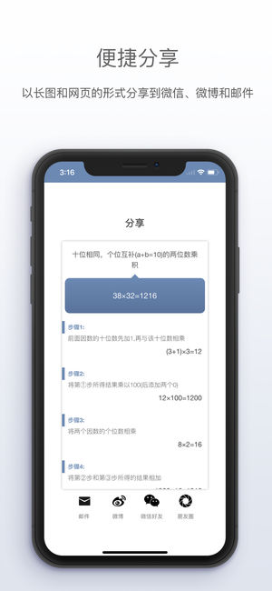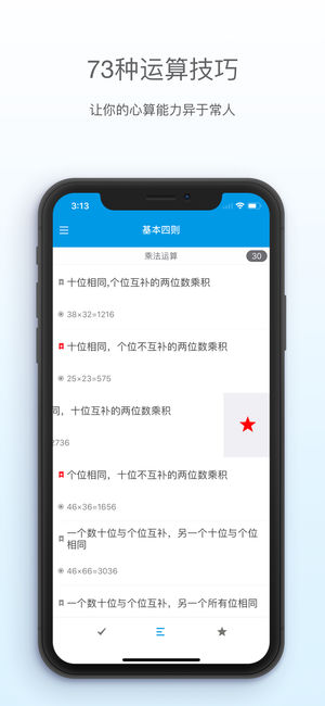 •Mencal 已更新为iPhone和iPad通用版并新增15种运算技巧 Mencal系统的介绍了包括加、减、乘、除和平方等多种形式的速算技巧,让你不用计算器和草稿也可以快速准确的计算出多位数乘法和平方的结果。熟练掌握Mencal的技巧足以让你拥有让普通人乍舌的心算能力。 Arthur Benjamin关于心算的TED演讲:A performance of "Mathemagic" http://www.ted.com/talks/arthur_benjamin_does_mathemagic ●示例: 十位相同,个位互补的两位数乘积(互补:两个数相加为10,100,1000...)…
