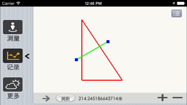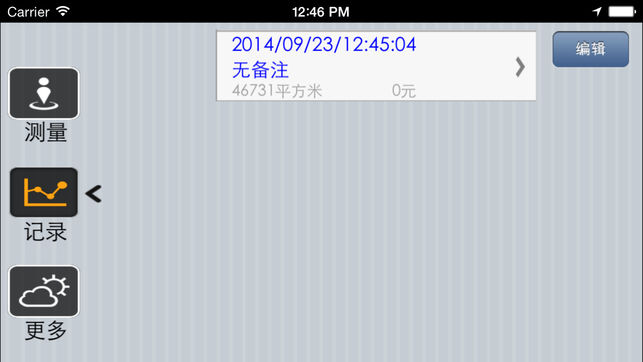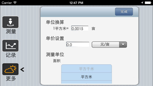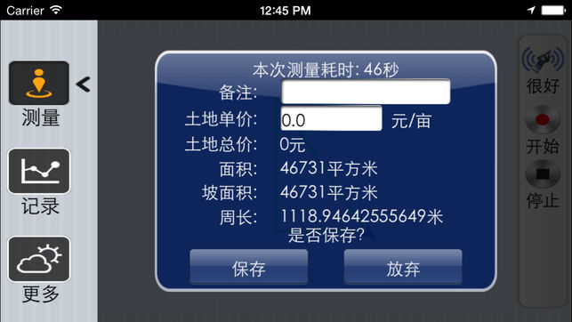 通过设备自身带的GPS定位装置,对用户定位后,用户可以使用本应用在户外进行实地测量,将自动计算用户走过区域的面积、坡面积、周长,并能够根据用户设置的土地单价计算总价,并保存。 在查看保存的历史记录的过程中,还能够测量任意两点之间的距离。 由于本应用需要通过GPS定位获得用户的精确位置,因此只能在户外使用,在室内将得不到正确的移动信息。