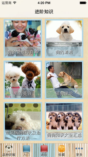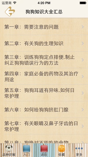 同时支持IPAD、IPHONE ,不耗流量,不用联网一样可以使用,无广告,无插件。 养狗大全分为养狗入门知识篇、进阶知识篇、名犬详解篇3大部分。全面系统地介绍了犬的各种生理特征、生活习性、毛色种类、名犬品种、饲养管理、调教与训练、育种与繁殖,以及常见疾病的防治等内容。以及养狗知识大全的汇总.其中名犬详解篇对世界公认的30余种名犬的品种、起源、发展史、外貌特征、鉴赏评判标准、用途、选购选育要领、饲养管理要点等均作了详尽的论述,并有各类高清名犬图片500多张。 目录 第一篇 入门知识篇 1、狗的起源与发展 一、狗的祖先是谁 二、狗是人类最早驯化的家畜 三、狗与人类文化 四、中国养犬现状…