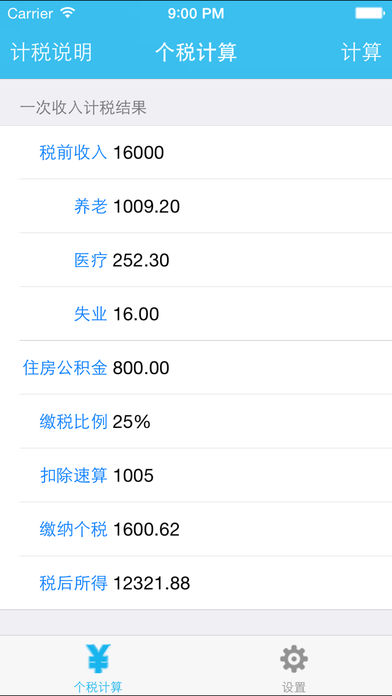 专业的个人所得税计算器,让您的税交的明明白白。 功能介绍 1、五险一金即可按照比例缴费计算,也可以按照固定金额缴费计算,方便灵活,缴费基数和比例均可按照实际缴费情况进行调整。 2、二次收入累计计税。 3、年终奖累计计税。 服务支持 Email:1438193450@qq.com QQ:1438193450