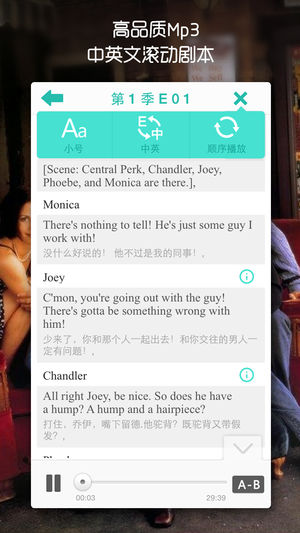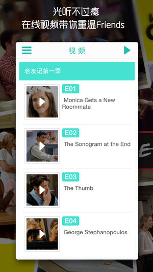 老友记,几乎成为英语学习的必须推荐,也被奉为无法复制的美剧经典。 从现在开始,我们就可以随时随地带着它,在公交上,地铁上,马桶上,睡觉前…… *坚持背完一季剧本,挥手告别字幕时代。~ *坚持背完两季剧本,与外国友人交流So easy~ *坚持背完三季剧本,可获得与外国偶像共进晚餐奖励一次……才怪 (ー∀ー) 以此类推 注意:个别用户无法下载是由于系统时间设置问题,请在设置-通用-日期与时间-选择自动设置 即可。 ——————1.3.1版本新增功能—————— 1.视频功能重新回归。喂!不要捧着手机在那傻乐啊。(视频来源搜狐,不支持下载) 2.字体大小调节功能。提供给您更舒适的阅读体验~ 3…