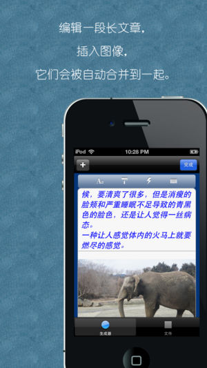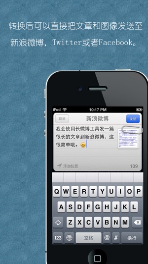 功能: 1.转换文本到图像,这样您就可以发送超过140字的文章到新浪微博。 2.您还可以改变字体,文本颜色和大小。 3.您可以从相册中选择图像插入或拍新的照片。 4.保存图像到本地以随时查看或发送,也可以使用别的app打开本地文件。 5.支持多节点,可以合并多个图像及文字。 注意:在使用前,请先在iPhone的设置里配置好您的社交帐户。