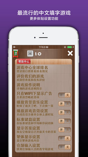 2012年最疯狂的填字游戏!你还在等什么! 创新填字玩法挑战你的脑细胞,现在就来下载! 一键求助微信朋友圈,时下最疯狂的社交游戏! 疯狂填字是最早的在线中文填字游戏,现在你可以在手机上玩填字了,既打发了时间,又增长了知识,你准备好挑战史上最疯狂的中文填字游戏了吗? 1、游戏一开始只有几道题可以选择 2、游戏时请选中空格查看提示 3、点击字母按键输入首字母拼音 4、正确完成词条就会转换为汉字显示 5、点击+号弹出功能菜单 6、完成题目80%解锁下一题 7、完成100%可以解锁答案,而且再奖励解锁一题 8、完成或购买道具解锁后可以双击查看答案 帮助中心还可以 1、切换音效…