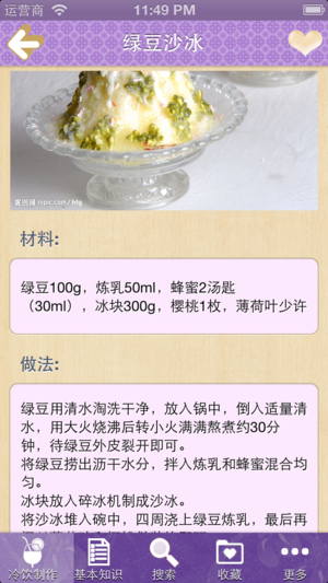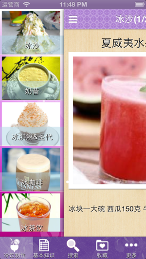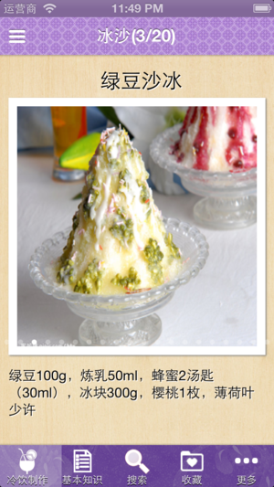 介绍冰沙奶昔、冰淇淋、圣代、冰咖啡、冰茶饮、冰水果捞、冰粥、更多花样冰品、冰饮等七大类近100款原料及制作方法。 无广告,离线本地浏览,不用联网也可以浏览。 头顶烈日逛街其实是一件很无奈的事情,夏季总是让你那么喜欢,又这么无可奈何。酷热难耐,很容易让你在逛街的时候口感舌燥,这时候各种冷饮就会浮现在你的脑海中,不得不说,冷饮已经成为了现在年轻人的“冷”朋友。冷饮的种类很多,冰茶、奶昔、沙冰等都属于冷饮,大家可以根据不同的口味来选择。完全可以自己制作各种冷饮,制作如此简单。