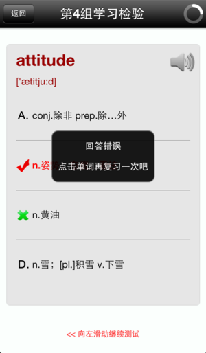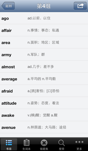 包括职称英语考试大纲ABC级以及公共英语等级考试1-5级全部分册词汇。免费离线使用,附有单词发音及详尽解释。 主要功能特点: * 分类清晰,智能分组 * 真人发音,单词资料解释详细 * 自主标记,掌控学习进度 * 分组测试,错题自动记录 * 生词随时收藏,方便查看 * 单词搜索,快速查词