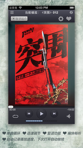 本书主人公陈池龙,是一个出生在福建农村一个普通农家的孩子,从小随父亲学做木工活,然而,一场父母为之定下的婚姻却改变了他的命运,妻子未过门时就被同村的无赖糟蹋,为了报仇,陈池龙怀着简单的想法参加了革命,一次次战争的洗礼,使他逐步成长为人民解放军中的指挥员,人生的遭遇,岁月的变迁,使他不但在革命战争中经历着一次次突围,他的人生,他的思想,他的心理也在经受着一次次的突围…… 软件功能: 1.通用应用,同时支持iPhone,iPod touch和iPad设备 2.可以自动顺序播放功能 3.可以自动记录播放位置,不用担心下次找不到听到哪 4.支持离线播放,即使不联网也一样听,到哪都不怕 5.支持手动拖拽前进、后退播放 6.精确到分钟的睡眠定时功能,让您睡眠更轻松 7.支持多任务功能,让您一边享受精彩有声读物一边还能打开其他的软件……做一切你想同时做的事 8.在兼顾软件容量以及更多课程的情况下,我们最大限度保证音频的高质量,每个有声读物片段都是经过我们精选和亲测 9.语速调节,可根据自己的喜好调节播放的速度。 如有闪退问题,请尝试更新您设备的iOS版本到最新版。 苹果相关内容讨论组,暨本应用支持QQ群:8694947 苹果相关内容微博,暨本应用支持微博:http://weibo.com/idevicehome