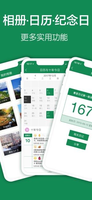 记手帐,记点滴,写日记,记账便签备忘录,生理经期记录。贴心的记录助手,亲密的生活伙伴。 青葱日记墙社区,交友聊天、兴趣话题讨论、分享情感的空间。 【手账】好玩有趣的电子笔记记事本。 【日记】文字图片、声音音频,时间轴点滴的形式记录生活的每一个瞬间。 【密码锁】保护私密记录,防止隐私泄露,支持Touch ID 指纹解锁。 【同步备份】珍贵的记录数据网络备份不丢失,专属云服务,更加私密。 【导出PDF】将日记、点滴、手帐、相册等制作成PDF文件,并可打印成书。 【记账本】通过记点滴功能可以管理日常开支、预算费用和账单账本。 【便利贴】通过3D Touch功能快速添加点滴便签,随时记录想法和事务。…