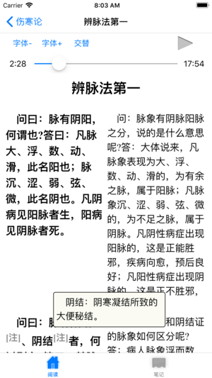 《伤寒论》为汉代著名医学家张仲景所著,被历代奉为中医的经典著作。该书运用辩证论治原则和方法,确立了中医诊治疾病的规范;所记述的理法方药相结合的辨治经验,对中医临医学的发展影响,极其深远;所记载的大量复方,组方严谨,疗效显著,被后世称作“众方之祖”。 本软件《伤寒论》具有以下特点: 1、文白对照。文言文和白话文同屏显示,支持对照和交替排版,轻松读阅读中医著作。 2、原文注释。原文附带注释,点击直接查看注释,加深阅读理解。 3、真人朗读。真人朗读优美动听,让你在眼睛得到休息的同时通过声音领略经典中医著作的魅力。 4、内置词典。内置文言文字典和高级汉语词典,阅读时遇到难懂的字、…