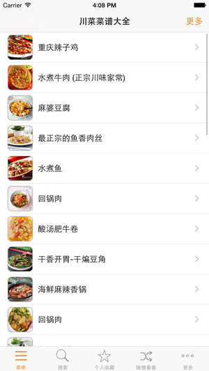最全最流畅的川菜系列菜谱大全,一次下载,所有信息离线使用。所有iOS设备通用,支持一键收藏,摇一摇随机查看,全文搜索。 ◆丰富的离线数据包,一次下载,无后续流量费用 ◆菜谱资料详实,步骤清晰 ◆一键收藏,随时查看,支持手势滑动切换 ◆全文搜索,键入食材、做法即刻查找相关菜谱