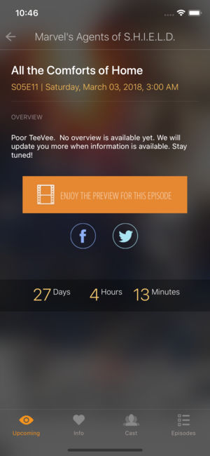 TeeVee 3 helps you effortlessly track your favorite TV Shows, on iPad & iPhone. It can shows you everything about your favorite TV Shows. Simply choose from trending list of shows or search for your show you like. Then you will have total overview over that show. **MAIN FEATURES** - Huge databas…