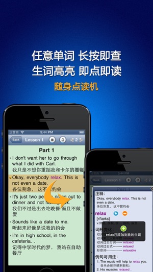ESL(English as a Second Language,以英语为第二语言/外语)是针对母语非英语的并把英语作为第二语言的语言学习者的专业英文课程,是外国学生申请美国大学所必修的一门语言课程。 √√标准美式发音+英汉对照+有声全文字典+点读机 《ESL》的每个句子都有标准的真人美式读音, 英汉对照, 即点即读. 文中每个英文单词都有详细的解释, 音标, 发音以及例句用法, 在阅读的时候只需在任意单词上长按超过一秒钟, 即可查阅, 即点即译, 真正做到哪里不懂点哪里. 新增单词检索功能, 即输即查, 方便使用. √√强大的学习功能 《ESL》提供了【我的生词】, 【我的收藏】…