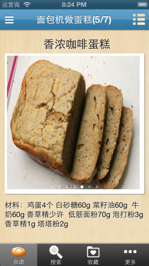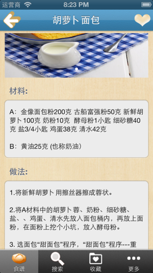说到做面包,大家首先想到的就是繁杂的准备工作,购买食材,按比例称重,打发,揉面,等待发酵,真是费时有麻烦。作为上班族我们,哪里还有心情来弄这些呢?不过,现在有了面包机的出现,就算是零起点也能轻轻松松做面包。也正是因为绝对天然,不含防腐剂和添加剂才让自己制作的面包更加健康。 本软件精选了近150多种面包机烘焙面包的配方,包括材料配方和做法。不仅有各式的面包做法,还有使用面包机做蛋糕、甜甜圈风味主食(饺子、意大利面)等。 离线浏览,不用联网也可以浏览,速度快,无广告。