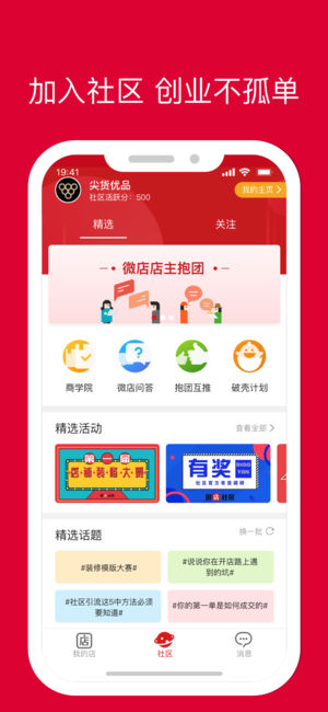 手机开店用微店,1分钟开店,便捷管理,支付快捷,多重认证,开店无忧,是逾7000万开店店主的共同选择 【1分钟开店,轻松管理】 1分钟简单操作,快速开启掌上店铺; 仅需一部手机,即可随时随地轻松管理订单。 【0手续费,支付便捷】 所有交易(除信用卡外)不收取任何费用; 支持微信/支付宝/信用卡/储蓄卡多种支付方式。 【多种营销工具,多重渠道】 多重营销工具、经典社交营销玩法案例,玩法多多; 小程序、公众号联盟,渠道无处不在,帮你高效获客。 【多组织/多重认证,保驾护航】 社区、组织、商学院、同盟会,帮你解决开店难题; 认证体系完善,确保店铺安全,为你的交易保驾护航。