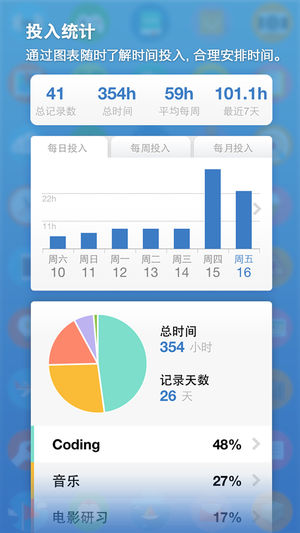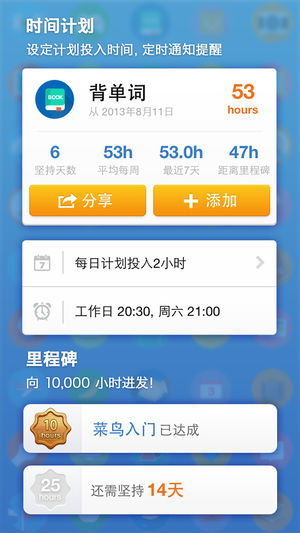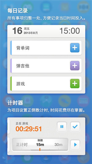 「iHour·时间投资计划」是一个帮助你规划、记录自己时间投入的 app,可以帮助你记录「背单词多少小时」「练琴多少小时」「看书多少小时」「Coding 多少小时」等需要时间累积来提高的技能。特有每日定时提醒,事件正倒数计时器,支持长达 10 年的时间规划。特别设计的成就系统,帮助你突飞猛进。 对任何一件事情投入 1 万小时,你都可以成为这个领域的专家。 =特别亮点= 1.每日记录:记录每天不同项目投入小时数。支持提醒和计时。 2.项目进度:呈现每个项目累计投入时间。 3.图表统计:最直观的投入时间统计分析。 4.成就挑战:80 余个成就等待挑战,隐藏成就让 app 探索充满惊喜。 5.分…