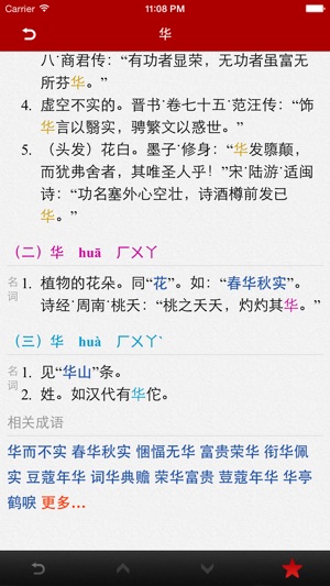 汉语字典词典简体版,华人必备学习工具! + 收录 Unicode 编码集所含的 20902 个汉字。 + 收录汉语词条 6 万多笔。 + 释义详细清除,大部分有文言文例证。 + 支持汉字搜索方式,支持部首、注音、拼音检索方式。 + 按照汉字的读音(语音)、词性分级列出释义,层次分明,方便查阅。 + 每个字条字包含注音、拼音、笔画数、部外笔画、释义、五笔码等信息。 + 主条目根据发音的声调显示不同的颜色,方便区分。 + 提供「历史记录」和「收藏夹」功能。 + 可以离线使用,无需担心流量透支。 Chinese Dictionary, it is an essential learning to…