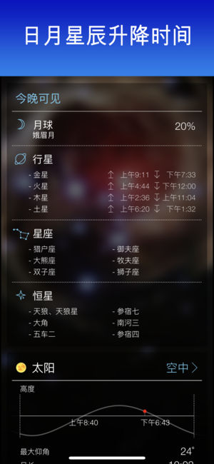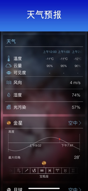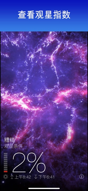 ***由苹果设计奖得主,世界著名Star Walk观星指南开发人员开发*** 今夜你需要了解的关于你所在位置的一切观星条件与令人惊叹的太空照片完美结合。不管是不是观星迷——这款应用将点燃你的好奇心。 每小时最精确的观星条件是根据七个参数计算并由一个观星公式归纳之后估算出来的,为你提供所有需要制定计划的信息。这个公式是Star Walk团队的一位数学博士开发的,并考虑到以下信息: - 今夜天空中有什么有趣的现象? - 能看到土星吗? - 会是多云吗? - 是不是要下雨了? - 光线太强? - 月亮太亮不利于观星? - 下一次流星雨什么时间? 你还能获得关于国际空间站、太阳、月亮、木星和任…