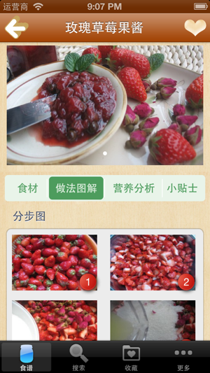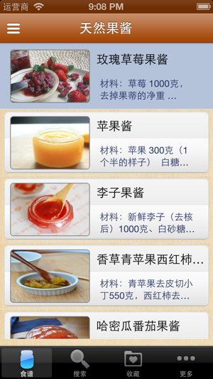 精选美味的天然果酱、柑橘类果酱、鲜果果冻的独家制作经验。每款均有详细步骤,轻轻松松做天然无添加的果酱给自己和家人。自己用健康食材做出无添加的健康果酱,让家人吃得放心又健康。按步骤详细讲解,每步并配有相应图片,保证可以成功操作100%,有图有真相。 无广告,浏览速度快,不耗流量,离线本地浏览,不用上网也可以使用。