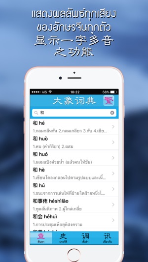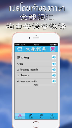 โปรแกรมพจนานุกรม 大象词典 โปรแกรมยอดนิยมสำหรับ iPhone , iPod touch และ iPad รวบรวมคำศัพท์ด้านภาษามากกว่า 100,000 รายการ แสดงอักษรจีนแบบย่อ Chinese(Simplified) , ภาษาจีนแบบดั้งเดิม Chinese(Traditional) , pinyin and jyutping มีหน้าประวัติของคำที่ได้ค้นหาแล้ว อ่านออกเสียงได้ 3 ภาษา คือ เสียงไทย เสียงจีนกล…