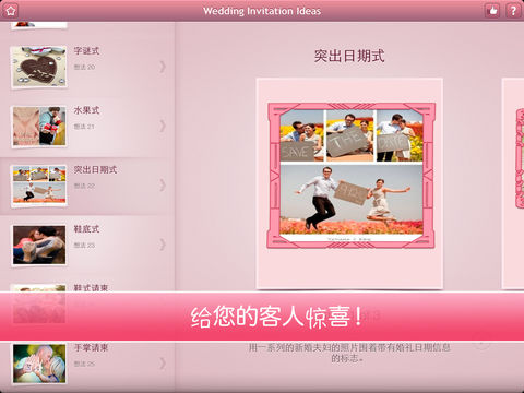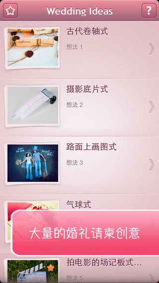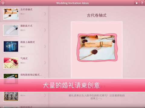 *** 大量的婚礼请柬创意; *** 每个创意想法的文本描述; *** 给您的客人惊喜! 传统的婚礼请柬是送给客人一张长方形卡片通知他们即将举行的婚礼,但是他们对这一用途的结婚请柬的构思不会忘记!这是一个很好的计划来展示创造力并把婚礼主题展现出来!有大量的婚礼请柬创意值得您留意。让您的婚礼邀请被客人永远铭记吧!