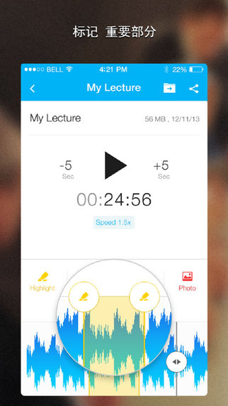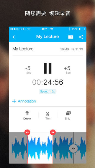 Recordium是一个专为iPhone, iPad, 和iPod Touch设计的功能强大,界面美观的录音软件。Recordium让你在播放或录制音频的同时标记重点部分,帮助你将注意力集中在录音中最重要的部分上。你可以轻松地将笔记,标签,和图片之类的附件加入录音中的任何部分,方便你在录音中进行搜索,使你迅速找到音频中被标记的重要的部分。你可以通过Dropbox和其他云应用软件来和你的朋友分享录音。Recordium拥有直观的使用界面,流畅的录音回放,用户可以通过各种压缩算法来自定义录音的大小和质量。这些特殊的功能使Recordium成为了人人手中必备的工具,尤其是学生,新闻记者,和音乐人。 Recordium, 看见你所听见! Recordium的特殊功能: *****标记录音中的重点部分***** 在录制或回放的同时标记一段音频中的重要部分。 轻松地在可触控的波形图上编辑重点部分 ****注释**** 添加你想要的任何标记。 在录音的不同部分添加多个笔记。 在录音的任何部分附加照片。(来自照相机或设备中的相簿) 通过单击预览你添加的注释。 轻松地在音频中移动注释。 通过单击编辑或删除注释内容。 **编辑工具** 修改或去除录音中任何多余的部分。 剪切录音中的任何部分来创建新的文件。 删除任何部分,即使是一段录音最中间的部分。 **高质量录音** 3种可调节的采样率(8, 22, 44.1 kHz)来定义录音的大小和质量。 4种不同的录音格式:WAV,CAF,AIFF,MP4. 特殊的MP4压缩格式:(比如将一小时的录音压缩到小于30MB。) **强大的录音** 后台录音和回放。 录音时暂停。 中断保护让你在录音中途接完电话后继续录音。 录音无时间限制,想录多久都可以。 自动保存让你不会丢失任何录音。 增强的录音音量让你更好地捕捉远距离的声音。 自动暂停功能可以跳过对话间隔来降低文件大小。 **强大的文件共享** 将你的录音上传到Dropbox, Google Drive, Evernote和其他云应用软件。 直接从Recordium将你的录音以邮件形式发出。 通过无线同步将你的录音传输到电脑上。 iTunes文件共享。 **文件管理** 通过标题,标签,笔记搜索文件。 迅速从文件列表中播放录音。 便捷的文件和文件夹管理系统。 在录音和回放过程中修改文件和文件夹名。 增加,删除,移动,以及重命名你的录音文件。 详尽的录音信息显示,包括大小,长短,和日期。 **导入多种格式** 导入音频文件格式,包括:MP3, MP4, WAV, AIFF, 和CAF。 **回放** 高敏感度的波形图。 放大,缩小,通过可触控的波形图进行可视化控制。 不同的回放速度以及可进行修改的音调。 5秒快进或倒带。 **愿望清单** 为你在下一次的Recordium更新中想看到的功能投票。未来的更新中将包含投票排名最先的功能。 我们非常期待听到你的反馈。