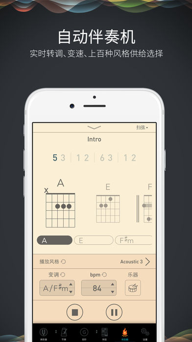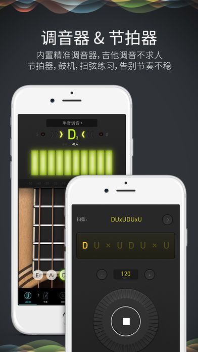 EUMLab 吉他大师 是集调音器、节拍器、和弦表、音阶及歌曲和弦查询于一身的吉他必备助手。 详细功能列表如下: 1. 专业级别的高准确度调音器; 2. 精确的节拍器,支持13种不同音色及自定义拍号; 3. 扫弦练习。 帮助你训练各种扫弦技巧,例如“下,下上,上下上”; 4. 鼓机。支持157组不同风格的打击音乐循环,涵盖摇滚、流行、爵士等风格; 5. 音阶。支持多达108种音阶,从爵士音阶,布鲁斯音阶到地里亚音阶; 6. 和弦表。 不仅可以查看和弦指法,还能点击听到和弦声音。 并且单和弦支持显示不同把位的和弦指法; 7. 5度环和弦表。 通过5度环和弦表,你可以轻松实现歌曲的转调查询; 8. 快速转调。例如乐谱是用D调写的,想转调到其他的例如G调需要查和弦表? 用吉他大师只需要一键完成; 9. 和弦反查。有时候在你的在即兴的时候发现了一个好听的按法,但是不知道和弦名字? 10. 和弦酷。吉他大师内嵌了和弦酷订阅服务,你可以快速创建,编辑,搜索可以播放的和弦谱,并轻松一键分享给好友; 11. EUMLab独家Chordec技术。吉他大师可以从音频中检测出和弦以及调性, 帮你轻松扒谱; 12. 自动伴奏机。革命性的提高了你的练琴体验,变速,变调,变风格,一键完成; 13. 支持左手优先模式。 14. 支持使用变调夹模式; 15. 支持可调中音A频率。例如某些古典乐器使用的定音不是现在常用的440Hz,使用尤克丽丽助手你可以随意切换到对应的定音频率,例如438Hz; 16. 79种调音模式。吉他大师的所有功能,包括音阶,和弦表,和弦谱都支持多种调音模式,想学习Drop D调音下的指法?完全没有问题。 17. 复合和弦,风格更加多样 总之,安上EUMLab的吉他大师,你就拥有了口袋中的吉他助手。无论是初学、进阶还是高级阶段,都可以找到适合你的功能。 >>> 超精确调音器 使用吉他大师,你不用再担心自己的吉他走音了。 吉他大师使用了EUMLab的超精确调音算法(精确度高达±0.1音分),通过使用你的iPhone/iPad的麦克风,App会清晰地告诉你当前的弦需要调紧还是调松。 >>> 超精准节拍器 节拍器使用的是和EUMLab专业节拍器(每日多达20万人使用)相同的声音引擎,精度高达±20微秒,帮助你准确地练习扫弦或指弹。 除此之外,我们还准备了36种扫弦模式,帮助你练习各种不同风格的扫弦方法。 有时候你可能想跟着鼓点练习,我们准备了鼓机模式,内置157种鼓点循环。 你可以跟着各种风格的鼓点即兴演奏。 >>> 和弦酷计划 吉他大师内置了和弦酷订阅服务,这绝对是吉他大师中的大杀器。你可以从我们的和弦表中选出任意和弦,配上各种风格的演奏技巧,组合成为你想要的和弦谱。 你可以轻松创建不同的和弦走向,并对他们进行变速和变调,以及音轨控制,帮助更好的即兴练习。同时,将不同和弦走向进行排列组合,你就可以轻松编辑一首歌曲,效率快Guitar Pro好几万倍!通过选择不同的鼓,贝斯及吉他的演奏技巧,你可以搭配出超过10万种不同风格。 此外,和弦酷计划也内嵌了EUMLab独家的Chordec技术。通过音频文件甚至麦克风识别,吉他大师可以帮你推断出歌曲中使用的和弦、调,甚至和弦进行,帮助轻松扒谱。整个使用过程就和使用Shazam一样神奇。同时,你也可以对识别的歌曲mp3进行变速不变调,以及变调不变速的处理,跟着原曲练习变得更加轻松。 和弦走向帮助你学一首歌就能弹奏上千首歌。 没错!这不是骗人的! 因为很多歌曲虽然歌词曲调不一样,但是使用的和弦及和弦走向是相似的。 一旦你学会了一种和弦走向,通过吉他大师你可以看到哪些歌曲和他使用的是同样的走向,于是你就秒会一首新歌了。 就是那种朗朗上口的感觉,根本停不下来。 >>> 音阶 练习音阶可谓是掌握一门乐器的每日任务。 学会了不同的音阶也相当于掌握了不同风格的演奏基础。 我们提供了108种音阶,包括基础的全音音阶,半音音阶,到布鲁斯,爵士音阶,甚至拜占庭式音阶。 无论你是新手还是高手,相信都能找到需要练习的音阶。 >>> 和弦表 我们的和弦表数据库包含了你所需要的各种和弦,包括大和弦,小和弦,6,和弦,7和弦,大7/小7和弦,属和弦,复合和弦等等等等。 不仅如此,你可以听到这些和弦的声音,查询他们的指法,以及不同的把位上的按法。同时,你也可以轻松按照五度环的规则进行和弦查找及变调 >>> 和弦反查 在即兴的时候发现了一个好听的按法,但是不知道和弦名字? 吉他大师告诉你! 总之,所有你能想得到想不到的功能,几乎都能在吉他大师中找到。 简直是居家旅行、买给小孩、送礼自用的必备良App。 ******* 注意 **** *** >> 以下功能仅能在专业版套餐中使用: 1. 高精度调音表盘 2. 扫弦节奏切换 3. 鼓机中157种节奏的切换 4. 高级音阶 5. 高级和弦 6. 和弦反查 7. 高级调音模式 >> 和弦酷计划及其相关服务独立于专业版套餐,属于订阅计划 和弦酷高级会员是自动更新订阅,在每一个订阅期(3个月)结束时,会从您的账户扣费并自动进入下一个订阅期。您可以随时从您的iTunes账户设置中取消自动订阅,但该期间的费用将不会被退还。和弦酷高级订阅产品有: * 基础计划:18元/3个月 * 高级计划:30元/3个月 和弦酷计划的隐私政策:http://bit.ly/cp-privacy >> 对专业版套餐而言,您一次购买即可终身拥有。 ===关于 EUMLab=== 感谢大家的支持,我们会努力为大家做出更多好用的音乐应用,帮助大家释放自己的音乐才能。 欢迎在微博,微信上关注我们: @EUMLab 给我们写信:feedback