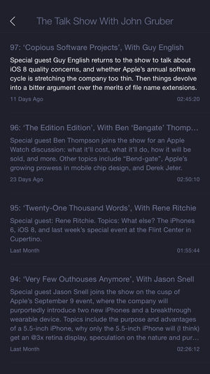 A simple, clean and efficient podcast app. - Control your podcasts with Apple Watch. - Automatic downloading of new episodes (the app will wait for opportunities to download when connected over Wi-Fi, user initiated downloads within the app can use both cellular/Wi-Fi). - Stream older episodes wit…