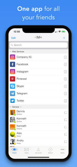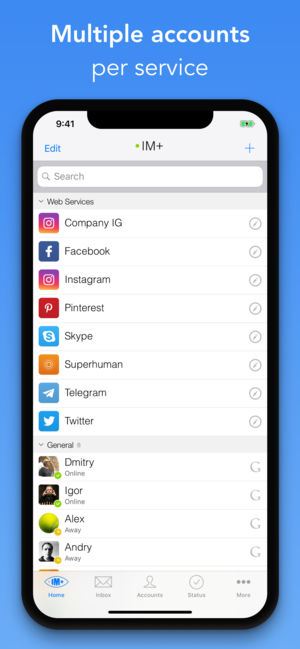 IM+ is an all-in-one app for messaging and social networking. Chat on Telegram, Google Talk and Messenger while checking your Facebook and Twitter feeds and swiping on Tinder. IM+ supports multiple accounts per service and saves you a lot of time and space on your iPhone. IM+ Pro 10 now enables cus…