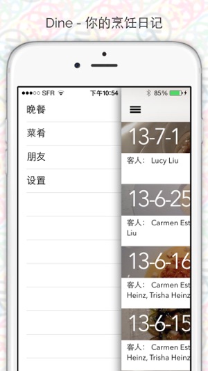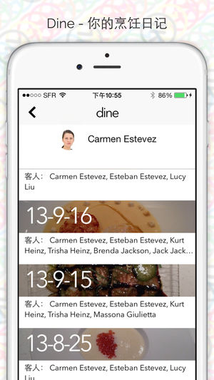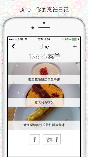 你的烹饪日记!记录你的晚餐派对。用靓丽的照片记录下你的菜单和菜品,按日期查找,不要两次做一样的菜。把你最好的菜单和最漂亮的菜做成一个相册,在Facebook上分享。