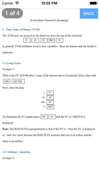 美国德州仪器TI-BAII Plus金融理财计算器 AFP、CFA、CFP、SOA、FRM资格考试指定用机 美国德州仪器TI-BAII Plus金融理财计算器 AFP、CFA、CFP、SOA、FRM资格考试指定用机 TI最畅销的金融计算器现在推出了iPhone App, 它是财务、会计、经济学、投资学、统计学、以及其他商务课程的理想选择,也是注册金融分析师(CFA)考试的理想选择。 主要功能 具有货币时间价值计算、应付利息计算、分期付款计算、成本加成率计算和折旧计算等功能。 操作提示功能可以通过显示当前变量符号和数值来指导您完成财务计算。帮助提示功能可以告诉您正在进行的工作和下一步将要进行的工作。 现金流量分析您可以存储高达24个不等额现金流量,每一个现金流量可有高达四数字的频度设置。 适用人群: BA II Plus是一款最符合中国人思维习惯的专业财务计算器,其操作简单方便、功能强大、性能稳定,在全球金融领域被广泛应用和推荐,是一款实实在在的商务级金融计算器。 BA II Plus是银行、证券、保险、房地产、教育培训等多种行业国际、国内资格认证考试指定专用计算器, 同时亦是学生的最佳选择,它可以陪伴你们走过大学时代然后开始商业世界的职业生涯,是美国市场最畅销的金融计算器 BAII Plus 金融计算器为以下考试指定用机: 理财规划师国家职业资格认证 CFP 特许金融分析是CFA 国际金融理财师AFP、CFP 注册国际投资分析师CIIA 金融风险管理师FRM 北美精算师SOA,中国精算师 美国、香港注册财务策划师RFP 功能简介: ◆操作提示功能 可以通过显示当前变量符号和数值来指导您完成财务计算 ◆计算IRR及NPV用于对现金流量 ◆货币的时间价值及摊销 ◆基于列表的统计 可以使您对数据点进行存储、编辑和更正。 ◆产生折旧表 ◆可以在年利率(标准利率)和实际利率之间进行利率转换 在使用中发现的任何问题和建议,请发邮件到heavenskybird@gmail.com 我们会根据您的建议及时做出功能改进,以便让大家更好的备考,谢谢!
