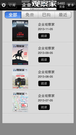 《企业观察家》杂志系河南能源化工集团(河南首家世界五百强企业)斥巨资打造的一份综合类高端财经杂志。杂志立足河南和中部,面向全国和全球,以“财富时代的人文解读”为切入视角,重点关注旗舰企业和快速成长企业等的价值理念、经营战略和商业伦理,力求构建中国企业智库和企业家精神家园,努力打造成中国企业家案头必备的财经读本。 关于本杂志订阅注意事项: 1、企业观察家杂志为月刊,一月一期 2、订阅杂志,您可以选择 .订阅三个月,价格3.99美元或25元人民币 .订阅六个月,价格6.99美元或45元人民币 .订阅1年, 价格14.99美元或98元人民币 订阅从下个月开始,本月杂志赠送 3、过刊…