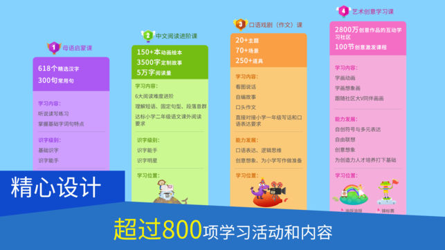 *获App Store推荐的创新儿童教育应用 *3-10岁孩子的线上母语学校 *儿童创造力社区:皮克斯品质+游戏化设计+社区化学习=创造力人才之路 【丰富多元的中文学习课程】 在汉字王国,孩子们学习的课程包括:汉语字词识记课、早期阅读进阶课、口语戏剧(口语作文)课、艺术创意学习课。 汉字王国具有完整的课程体系,课程级别的选择者除了父母也包括孩子本人。也就是说,孩子的“学习能力和兴趣”可以决定他最终能到达课程哪一级。作为父母,要做的就是,为孩子开放全部课程内容,让孩子去选择! 【助推智力发展,幼小衔接适用】 孩子们在这里爱上识字与阅读。此外,孩子们可以运用中文综合技能,进行生动地创作。包括:…