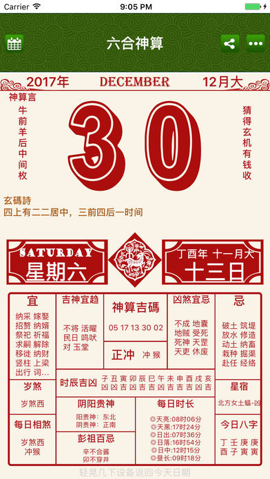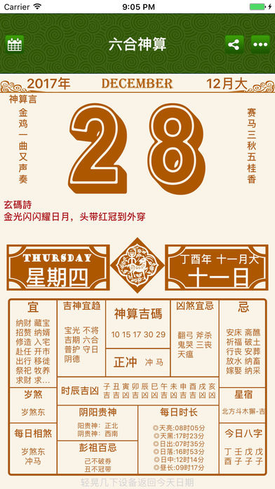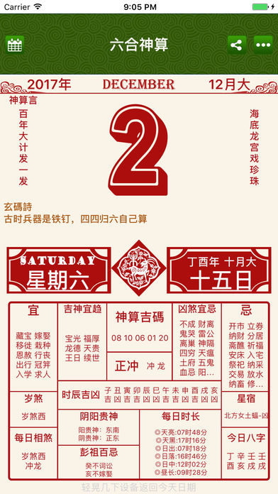 老黄历-六合神算专业版,8号开始限免优惠7天,千万别错过。 老黄历六合神算专业版本,更新到最新2017年数据库。 最专业最权威最新的黄历查询,同时也是最经典的黄历版本。 适合喜欢怀旧的朋友们。 老黄历-六合神算专业版记载2017年每日公历、夏历日期、干支、节气、宜忌、中国传统节日等。并且专门针对iOS 10.x 进行设计,在完全兼容旧系统的基础上,提供iOS 10.x下的最舒适的操作体验,最快速的操作反应。 全功能版提供非常实用的增强功能,黄历转换,宜忌快速查询,绝对是2017年你不可错过的。