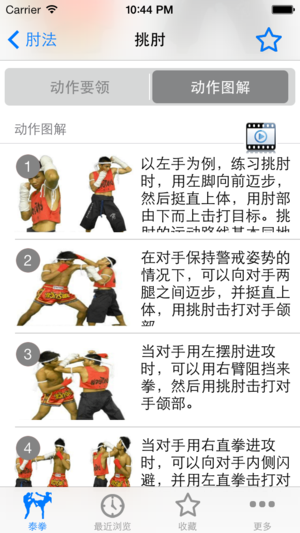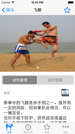 泰拳是泰国民族的国技,享有“五百年天下无敌手”之美称,泰拳是运用身体四肢的双拳、双肘、双膝、双脚这八个部位作为攻击武器来进行搏斗较技,故又称“八臂拳术”。泰拳是一种以腿法为主要动作,以肘膝进攻为主要特长,以腹式呼吸为主要方法,以强功硬取为主要风格。 该软件助您掌握泰拳快速入门与实战绝技。包括拳法、肘法、腿法、膝法、拳腿组合的动作要领和动作图解,以及视频。如果你想成为高手吗,不妨学习这世界上最凶猛的徒手搏击术吧! 离线使用,不用上网也可以使用,速度快,无广告