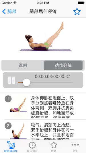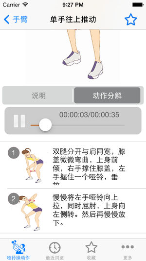 立体塑型套路动感十足、热力四射的动作,激发体内的High元素,急速燃脂,塑造凹凸有致的完美身型。中高强度的运动量,提高脂肪的燃烧率,紧致松弛的肌肤,改善心肺功能,提升耐力和抗疲劳度,让你时刻精力充沛!本软件为哑铃美人定做的热身操,活化关节、预热肌肉,提高身体的灵活度,有效预防运动伤害,充分调动身体里的活力因子! 离线使用,不用上网也可以使用,速度快,无广告。