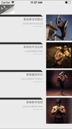 泰拳是泰国民族的国技,享有“五百年天下无敌手”之美称,泰拳是运用身体四肢的双拳、双肘、双膝、双脚这八个部位作为攻击武器来进行搏斗较技,故又称“八臂拳术”。 泰拳是一种以腿法为主要动作,以肘膝进攻为主要特长,以腹式呼吸为主要方法,以强功硬取为主要风格。 该款APP助您掌握泰拳快速入门与实战绝技。包括:拳法、肘法、腿法等拳腿组合的动作要领和动作详解,以及视频。 如果你想成为高手吗?不妨学习这些世界上最凶猛的徒手搏击术吧!